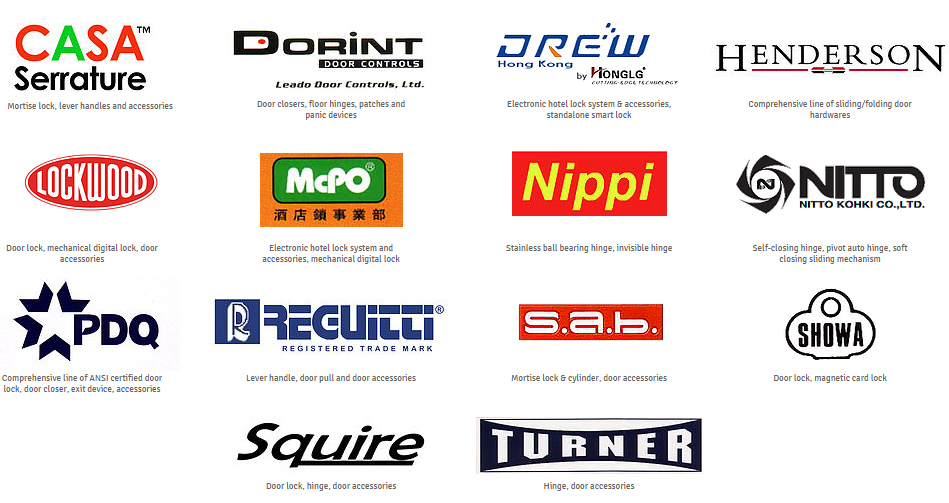 We represent such manufacturers as P.C. Henderson, Reguitti spa, Dorint, Showa, Nippi Hinge, PDQ Locks, McPO Hotel Lock, Drew Hotel and Electronic Lock, Casa Serrature, Lockwood and Squire among others.
